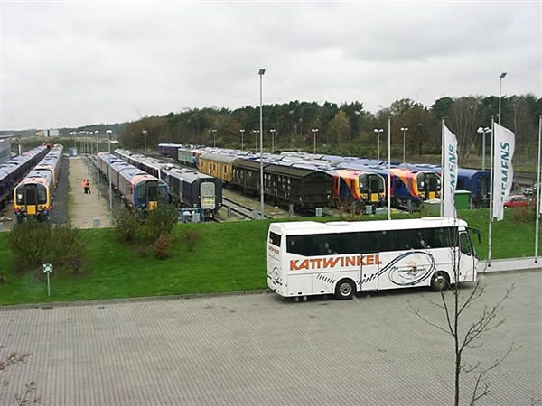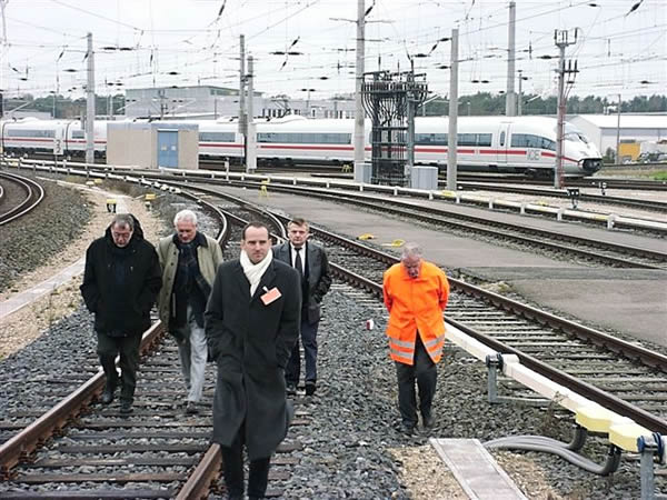 Bei bereits frischen Temperaturen präsentierte die Schleifkottenbahn GmbH am Freitag dem 8.11.2002 im Rahmen eines Besuches des Prüfzentrums für Bahntechnik in Wegberg-Wildenrath die neue Technik des in naher Vergangenheit von Siemens-Railsystems und der RWTH Aachen entwickelten ‚CargoMovers‘. Das Fahrzeug wurde kürzlich auf der Innotrans 2002 in Berlin der Fachöffentlichkeit vorgestellt. Der Einladung gefolgt waren zahlreiche interessierte Vertreter aus Politik und Öffentlichkeit des märkischen Kreises sowie den mit der Materie befassten und für den regionalen Bereich zuständigen Mitarbeitern der Deutschen Bahn. Beim Siemens-CargoMover handelt es sich um einen auf Schienen selbstfahrenden, durch entsprechende Sensorentechnik gesteuerten Güter-/Containertragwagen, der über das europäische ETCS und GSM-Rail per Funk seine Fahrdaten bekommt und somit auch jederzeit seinen Standort und Status dem Betreiber melden kann. Der ohne Fahrpersonal sich im Schienennetz selbst navigierende Güterwagen kann nach Beladung mittels einer Wechselbehälterumsetzeinrichtung (z.B. Container-Lift, Container-Mobiler o.ä.) auch und besonders an kleinen bis mittelgroßen Ladestellen und Firmengleisanschlüssen durch Eingabe der Zielladestelle (z.B. durch Verlader,Versandfirma) auf staulose Reisen geschickt werden. Nach einer bisher erfolgreich verlaufenen rein technischen Erprobung innerhalb des Prüfcentrums Wildenrath ist das Entwicklungs- und Erprobungskonsortium mittelfristig auf der Suche nach geeigneten weiteren Demonstrations- und Einsatzstrecken, auf denen das System seine Alltagstauglichkeit unter Beweis und so auch einer weiteren Öffentlichkeit vorgestellt werden kann. Friedrich-Wilhelm Kugel, Geschäftsführer der SKB, hat es sich in diesem Zusammenhang nicht nehmen lassen, die Schleifkottenbahn als weiteres Erprobungsterrain für dieses äußerst innovative schienengebundene Cargosystem für den ländlichen Bereich anzubieten.