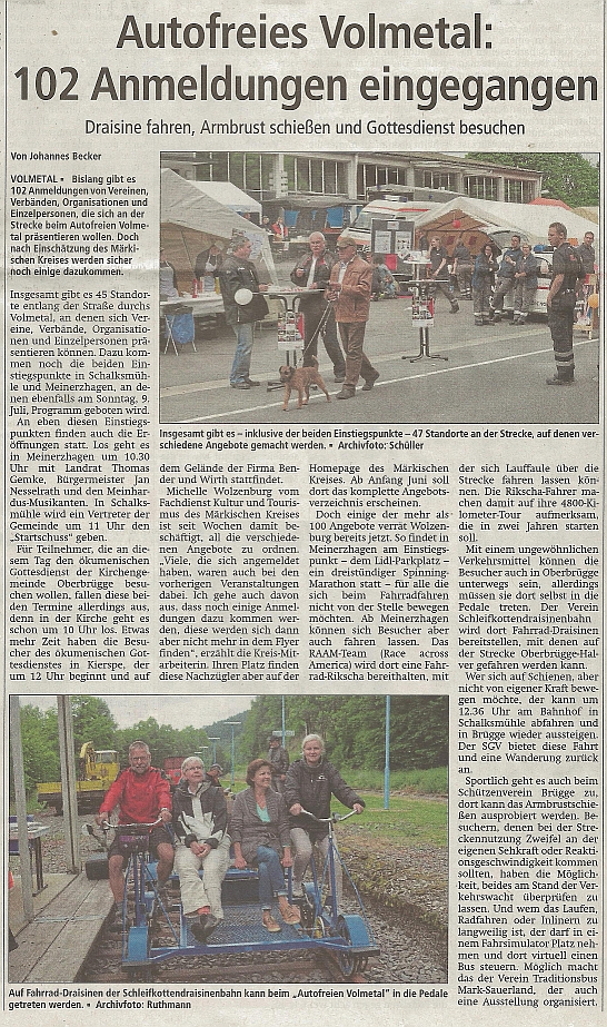 Der Aktionstag „Autofreie Volmetal“ wurde ursprünglich vom Aktionsbündnis Volme-Agger-Bahn angeregt, um auf die Lücke im Bahnnetz zwischen Meinerzhagen und Brügge hinzuweisen und um für den Lückenschluss zu werben. In diesem Jahr gibt es wieder ein Autofreies Volmetal, und zwar am Sonntag, den 9. Juli.