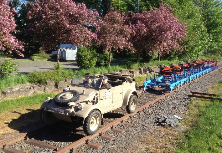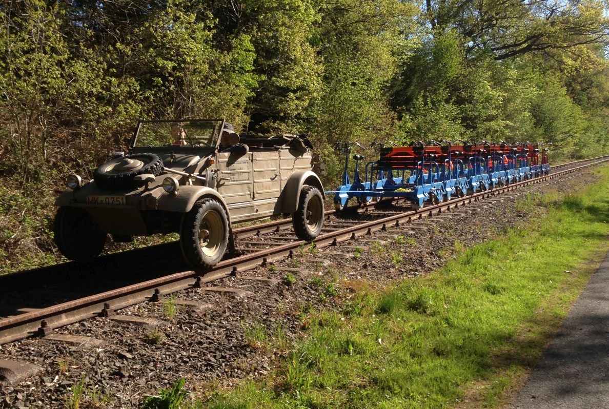 Das Zuführen der Draisinen von Oberbrügge nach Halver hat freundlicherweise der Oldtimer-Liebhaber Ulrich Turck aus Halver übernommen: Mit seinem historischen VW-Kübelwagen, der mit Hilfe von zusätzlichen Spurkranzscheiben auch auf Schienen fahren kann, waren die Draisinen im Nu in Halver. Vielen Dank dafür!
