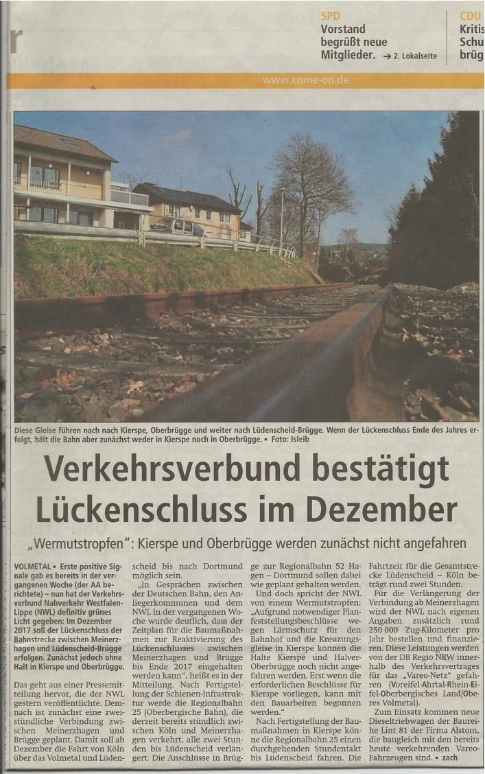 Allem Anschein nach wurde eine Lösung gefunden, doch noch in 2017 planmäßigen SPNV zwischen Meinerzhagen und Brügge stattfinden zu lassen und damit – endlich! – die kleine Lücke auf der Volme-Agger-Bahn zu schließen. Aber weil aus planungsrechtlichen Gründen die Kreuzungsmöglichkeit in Kierspe nicht rechtzeitig fertig gestellt und eine Reihe von Bahnübergängen nicht rechtzeitig erneuert werden können, fahren die Züge zunächst nur zweistündlich und ohne Halt in Kierspe und in Oberbügge: