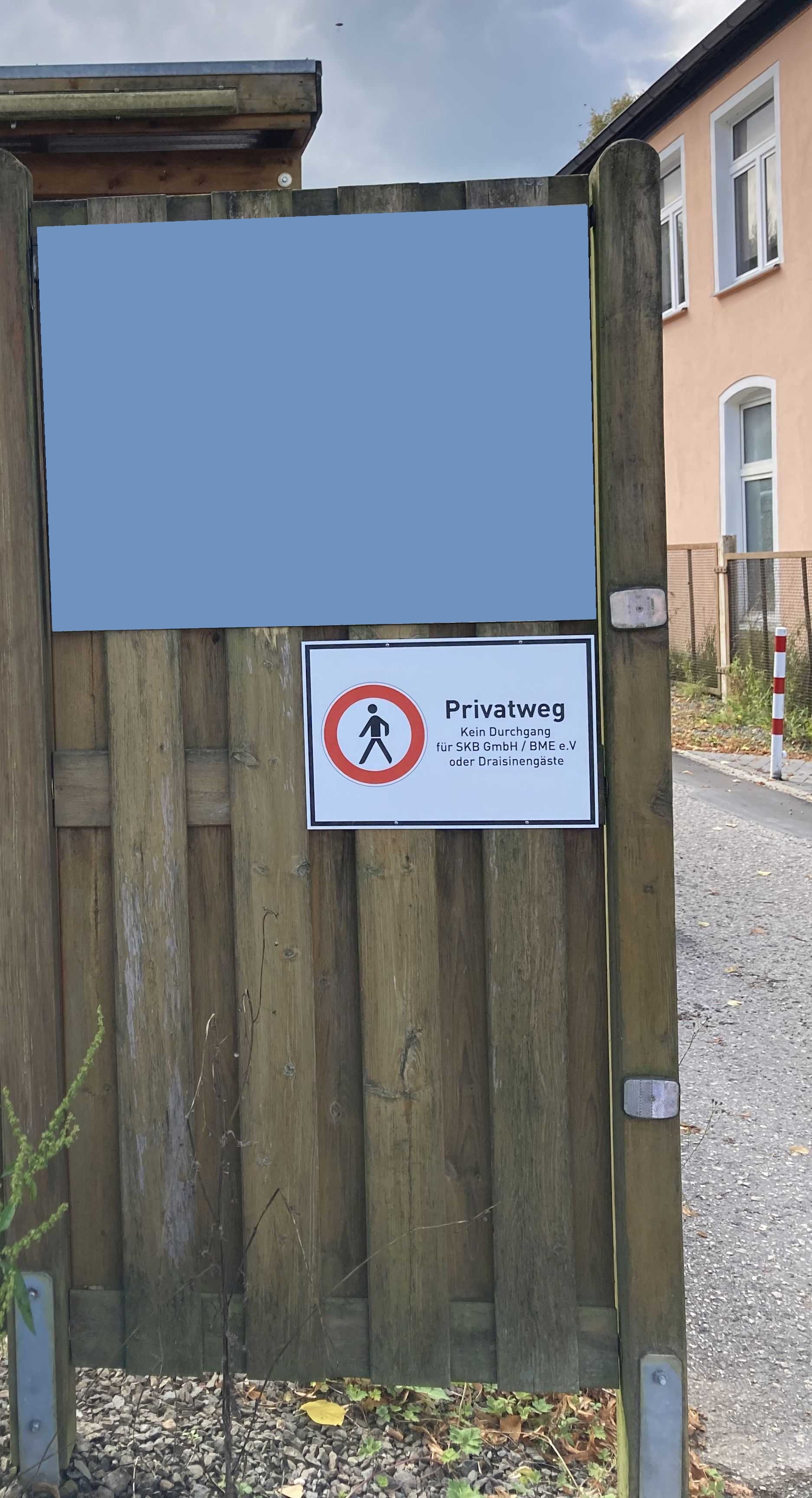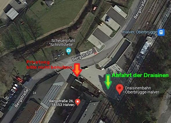 Leider versuchen Teile der Nachbarschaft, den Draisinenbetrieb verbieten zu lassen. Wir bitten deshalb nachdrücklich, nicht den vor dem Haus Bergstraße 26 liegenden Privatweg zu benutzen:
