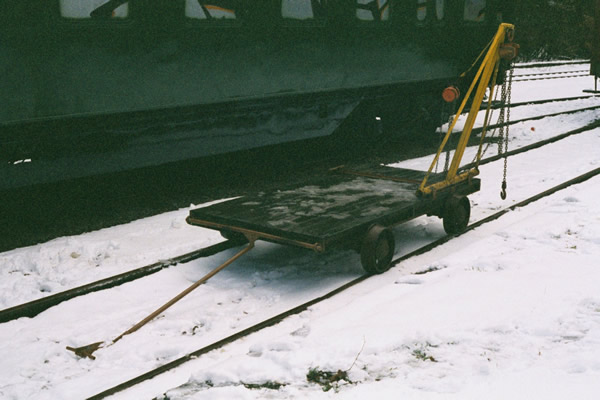 …mit variablem Ladebaum bei Gleisbauarbeiten eingesetzter handbetriebener Schienenwagen
